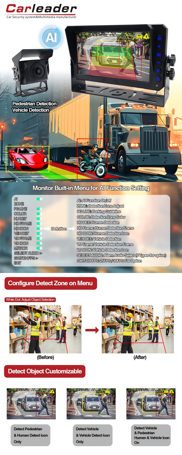 Telecamera per il monitoraggio del conducente AHD in cabinaCarleader 7 pollici AI BSD Supporto del sistema di monitoraggio del rilevamento dei punti ciechi La calibrazione AI è progettata con algoritmi AI avanzati ad alta precisione e funzionamento del menu cz intuitivo. Questo sistema di telecamere AI fornisce ai conducenti avvisi dinamici di pedoni e veicoli ad alta precisione in tutte le condizioni atmosferiche, riducendo efficacemente il rischio di incidenti stradali. Il sistema di telecamere di monitoraggio AI è adatto per auto private, flotte commerciali e veicoli speciali. Il sistema di intelligenza artificiale della flotta ha una forte integrazione e compatibilità, durata e capacità di monitoraggio in tempo reale.