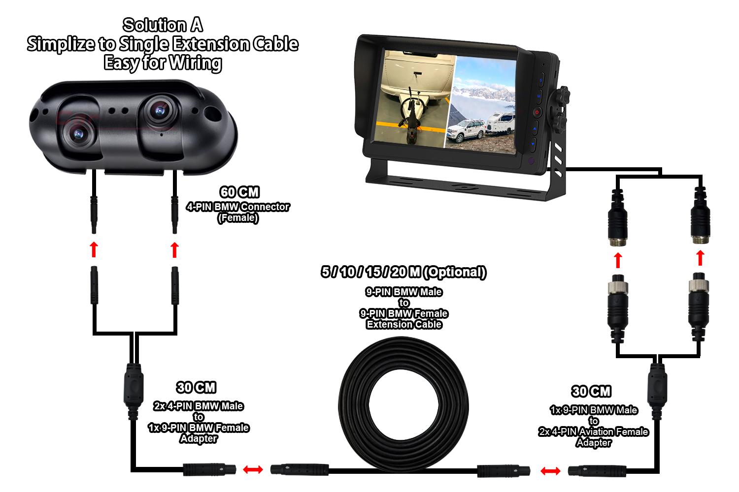 Rilevamento dei punti ciechi AI Telecamera per retromarcia Allarme sonoro e luminoso integratoTelecamera posteriore Carleader AHD Starlight con doppio obiettivo adatta per camper, una telecamera AHD di nuova concezione e di qualità eccellente per strumenti privati, integrata con doppio obiettivo in un'unica fotocamera e angolo dell'obiettivo regolabile separatamente, che consente all'utente di visualizzare sia la vista ravvicinata che quella lontana sullo stesso monitor. Questa fotocamera non è adatta solo per veicoli pesanti, come camion, autobus, carrelli elevatori, ecc; adatto anche per camper, come camper e roulotte.