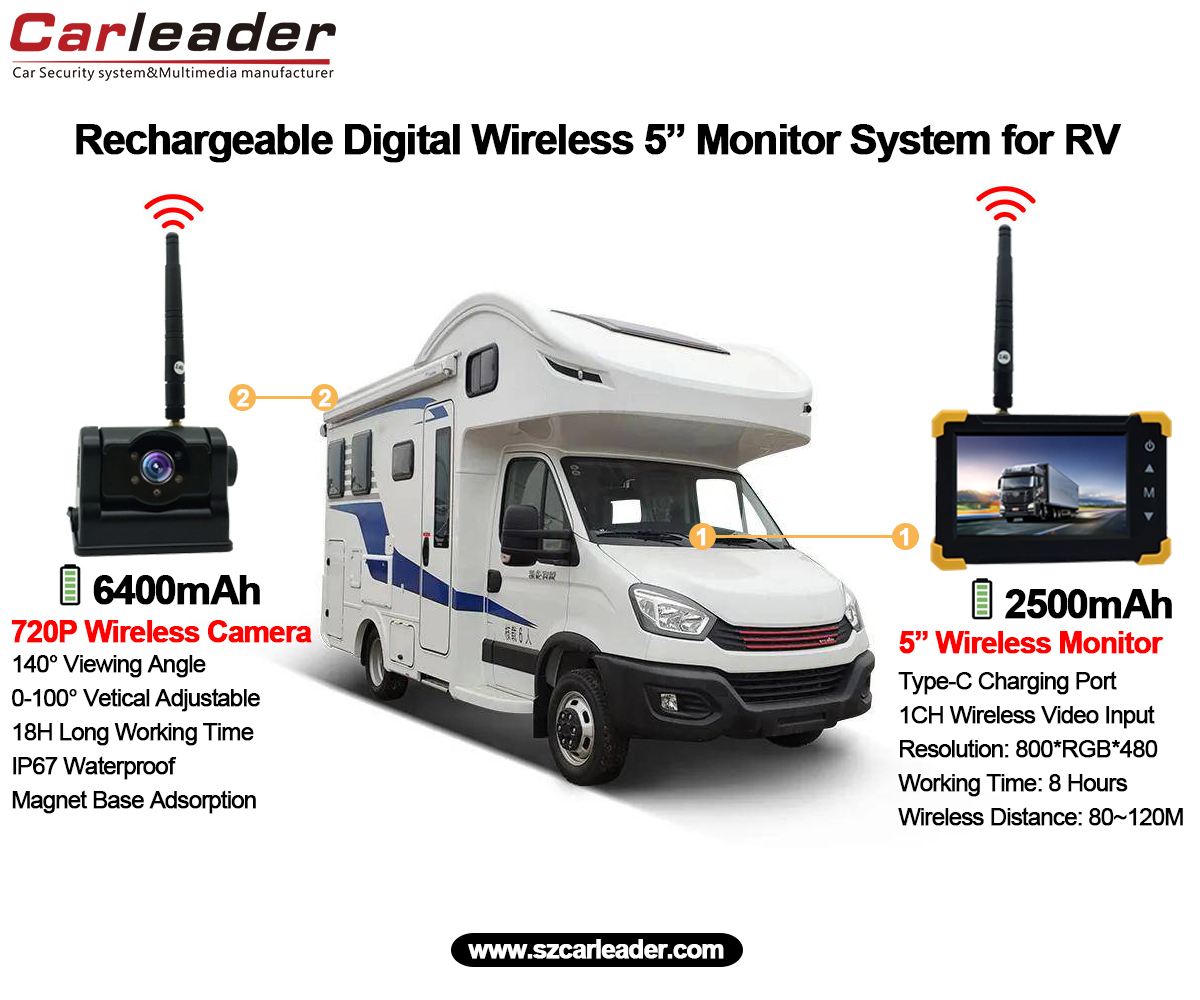Sistema di monitoraggio wireless digitale ricaricabile da 5 pollici Carleaderè un all'avanguardia2.4G Sistema di monitoraggio dell'auto wireless digitaleProgettato per migliorare la sicurezza e la comodità della guida. Combinando un monitor IPS da 5 ″ ad alta definizione e una versatile telecamera wireless, questo sistema offre trasmissione video in tempo reale, una solida durata e funzionalità intuitive per un funzionamento senza soluzione di continuità in diversi ambienti.