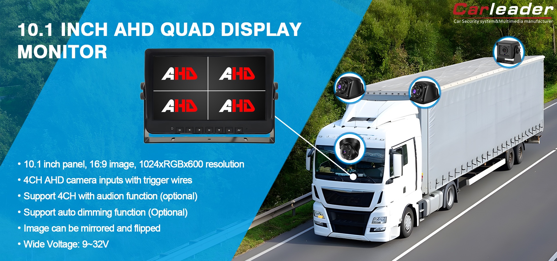 Carleader Ingresso 4AV da 10,1 pollici Visualizza quadrile Ahd Vehicle Monitore kit fotocameraIncludi 1x monitoraggio quad AHD da 10,1 pollici ad alte prestazioni, telecamera a cupola 1x in cabina, telecamere a vista laterale 2x (sinistra e destra), fotocamera posteriore 1x, questa soluzione progettata per applicazioni versatili di sorveglianza e display. Combinando la tecnologia all'avanguardia con le funzionalità incentrate sull'utente, questo monitor offre visioni nitide, funzionalità robuste e adattabilità per soddisfare diverse esigenze operative.
