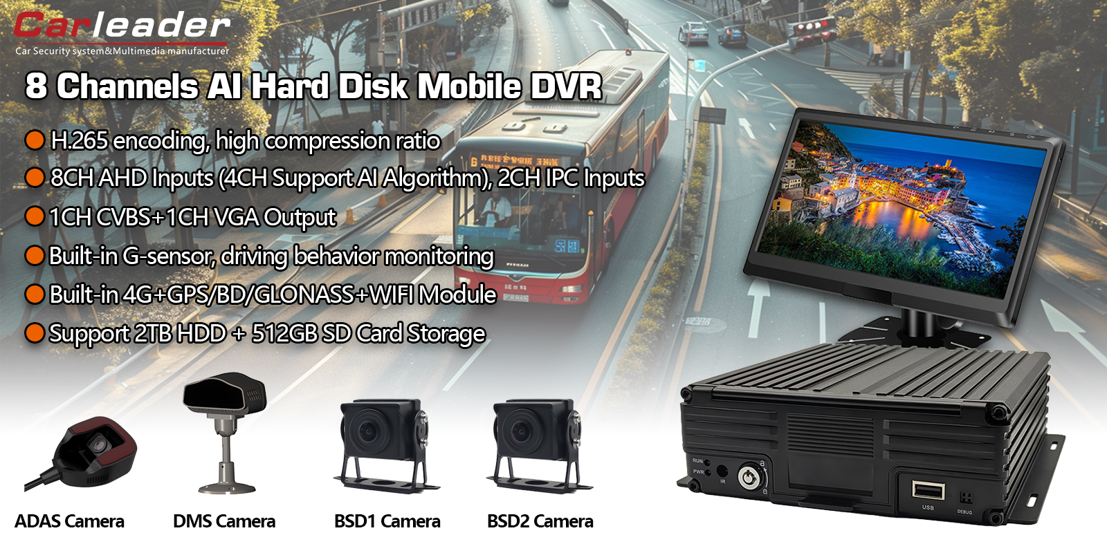Presentazione di CarleaderSupporto DVR mobile HDD 8CH AI ADAS+DMS+BSD, un videoregistratore digitale con disco rigido di fascia alta a 8 canali progettato per la sorveglianza veicolare professionale e la gestione intelligente della flotta. Combina una robusta progettazione hardware con algoritmi AI avanzati tra cui ADAS, DSM, BSD. Offre registrazione video affidabile e di alta qualità, assistenza completa alla guida e monitoraggio proattivo della sicurezza, il tutto in un unico sistema integrato.