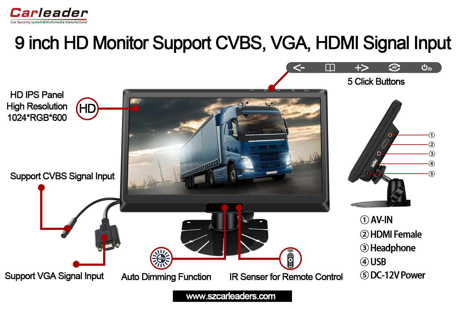 NostroMonitor HD con schermo IPS da 9 pollici Carleader che supporta ingressi CVBS+HD+VGAha la migliore qualità video e chiarezza di tutti i nostri monitor per veicoli , e dispone di 5 pulsanti speciali nella parte superiore del monitor, supporto per monitor per auto con schermo IPS da 9 pollici CVBS, HD, VGA è attualmente disponibile e in vendita.