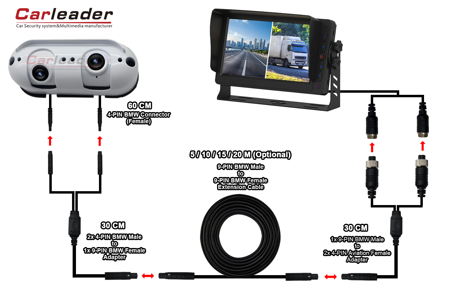 La prima soluzione utilizza solo un cavo di prolunga (connettore BMW a 9 PIN), cavo diviso da 1 a 2 per entrambe le estremità per collegare la fotocamera e il monitor. Perché questa soluzione utilizza solo un cavo di prolunga, il che rende il processo di cablaggio più semplice e conveniente.