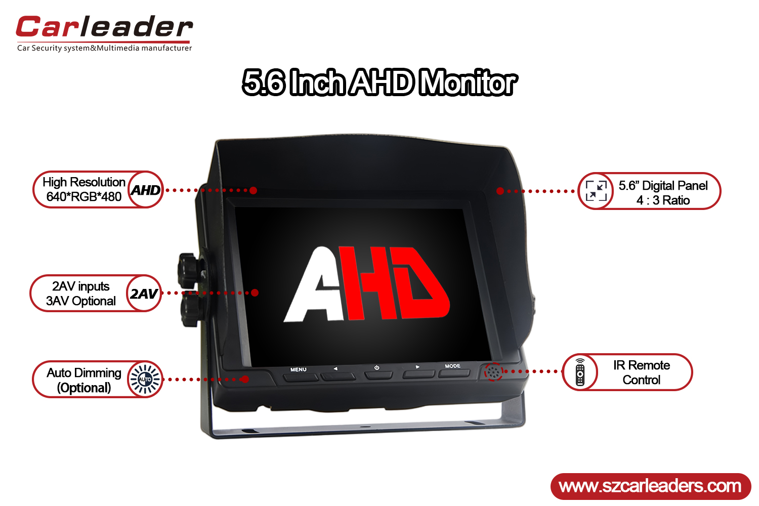 CapocarroMonitor di backup del veicolo con ingressi AHD da 5,6 pollici 2CHè un 5,6 pollici di livello professionaleMonitor retrovisore AHD, progettato per fornire un'immagine chiara e affidabile dei sistemi di sicurezza e monitoraggio dei veicoli. Caratterizzato da un design moderno e funzionalità robuste, è la soluzione ideale per i veicoli commerciali e privati che richiedono una visione posteriore affidabile.