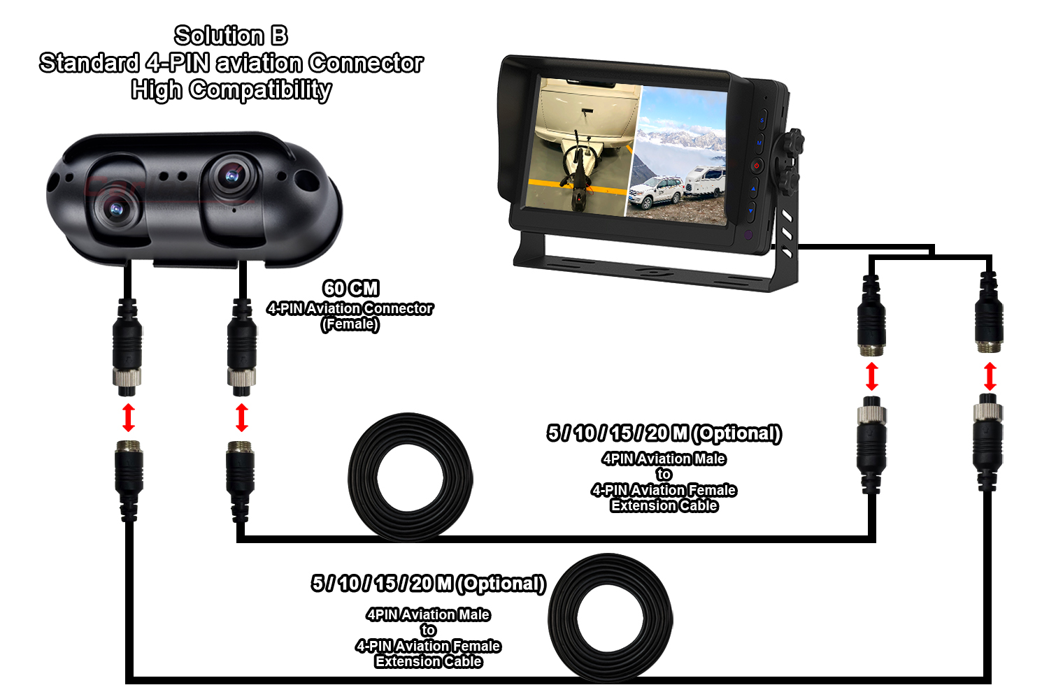 Capocarrooffrirà due diverse soluzioni di cablaggio per la telecamera posteriore AHD Starlight a doppia lente adatta per camper, per soddisfare le diverse esigenze di cablaggio: