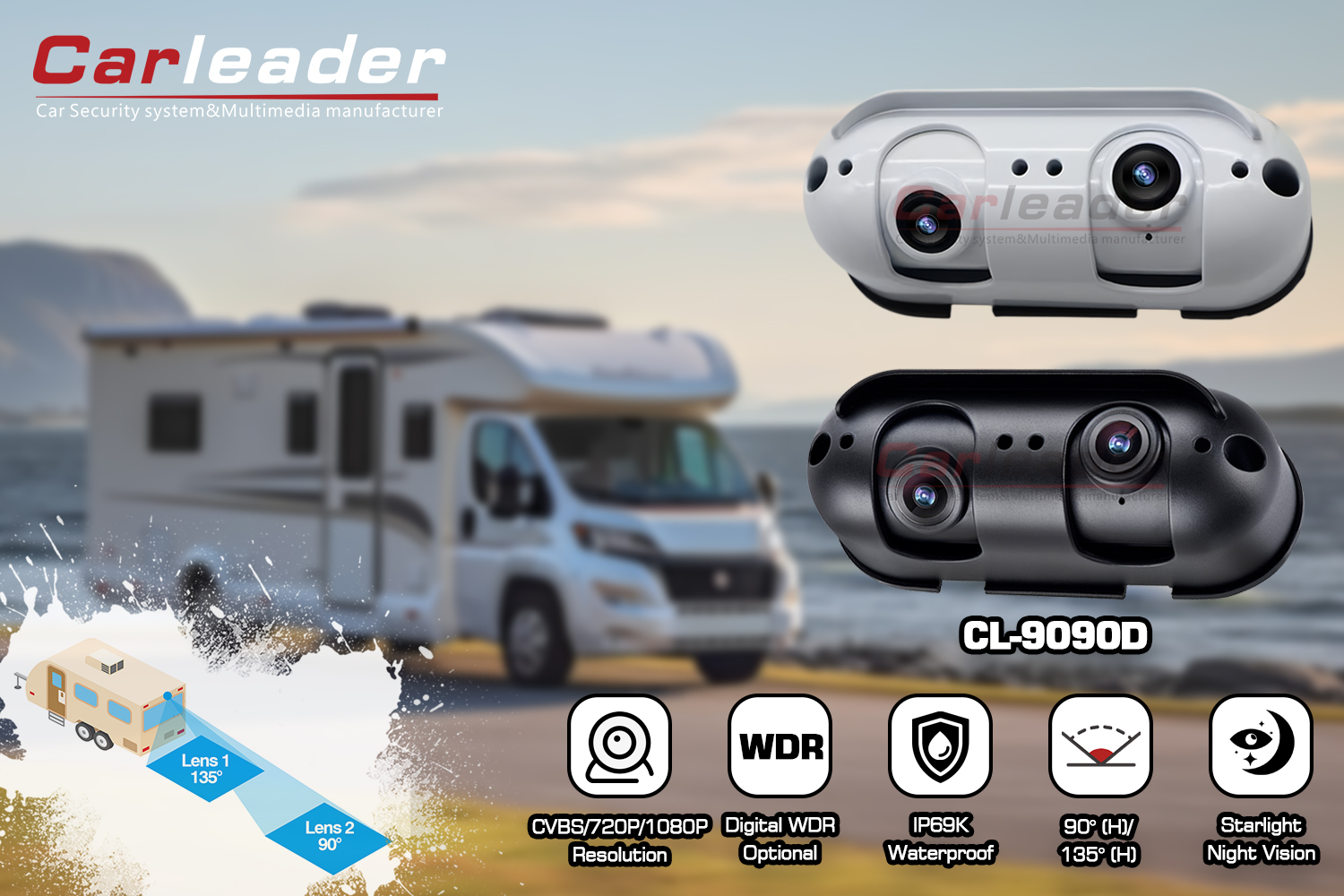 CapocarroTelecamera posteriore AHD Starlight a doppio obiettivo adatta per camper, una telecamera per retromarcia AHD con attrezzatura privata di Carleader, il design a doppia lente consente all'utente di avere una chiara prestazione di visibilità del mirino retrovisore a distanza ravvicinata e lontana. Il suo alloggiamento in lega di alluminio e la classificazione IP69K rendono la fotocamera più robusta e durevole in qualsiasi condizione atmosferica avversa. Questa fotocamera non è adatta solo per veicoli pesanti, come camion, autobus, carrelli elevatori, ecc; adatto anche per camper, come camper e roulotte.